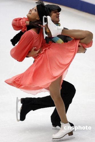 11月7日,2008中國杯世界花樣滑冰大獎賽在北京首都體育館進(jìn)行第二天的爭奪,俄羅斯組合多姆尼娜、沙巴林在冰舞創(chuàng)編舞比賽后,以95.58的成績繼續(xù)排在參賽的十對選手之首。中新社發(fā) 盛佳鵬 攝