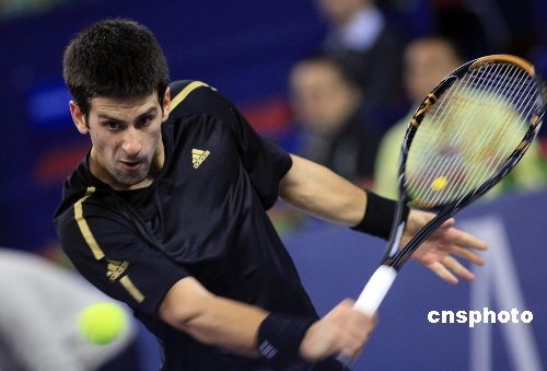 11月9日,2008年上海網(wǎng)球大師杯在上海旗忠網(wǎng)球中心拉開戰(zhàn)幕。在當日進行的金組首場比賽中,塞爾維亞小天王德約科維奇以2比0戰(zhàn)勝阿根廷選手德爾波特羅,迎來自己在上海網(wǎng)球大師杯上的首場勝利。去年,德約科維奇首次亮相上海網(wǎng)球大師杯,小組賽3戰(zhàn)盡墨。中新社發(fā) 湯彥俊 攝