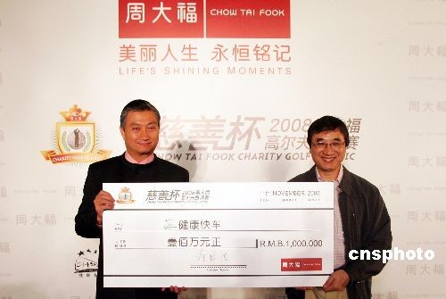 圖為周大福董事鄭錫鴻先生向健康快車主席陳振彬先生(左)捐贈本次邀請賽籌募的100萬元善款。
