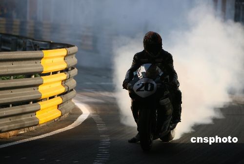 十一月十五日,英國(guó)選手伊斯頓(三號(hào))在澳門(mén)舉行的“名門(mén)世家”第五十五屆澳門(mén)格蘭披治大賽車上奪得第四十二屆澳門(mén)格蘭披治摩托車大賽冠軍。中新社發(fā) 武仲林 攝