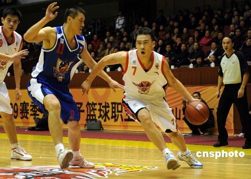 2008年11月16日,2008-2009CBA聯(lián)賽常規(guī)賽首輪在山東濟南的比賽中,主場作戰(zhàn)的山東黃金男籃以94-74戰(zhàn)勝天津榮鋼男籃,取得開門紅。中新社發(fā) 張侃 攝