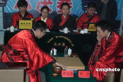 11月19日,“永城杯”第二十一屆中國(guó)圍棋名人戰(zhàn)五番棋決賽第四局較量在河南省永城市進(jìn)行,古力九段在“福地”又下一城,執(zhí)黑289手中盤(pán)擊敗樸文堯五段,將總比分扳成2比2平,衛(wèi)冕冠軍的希望大增。圖為樸文堯(左)與古力在對(duì)局中。中新社發(fā) 沈晨 攝