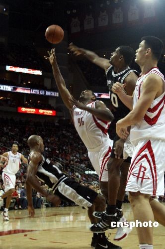 當?shù)貢r間11月29日晚,火箭在主場以103-84大勝馬刺,成為西南區(qū)的領頭羊;鸺装l(fā)五虎得分都上雙,姚明打了27分鐘,拿下12分,但只搶1個籃板,蓋帽3次。中新社發(fā) 歐文 攝