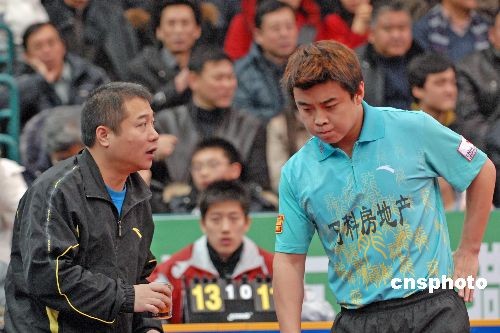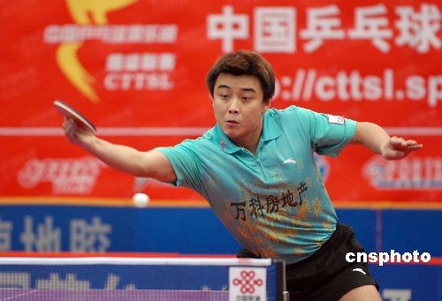 12月6日晚,2008年乒超聯(lián)賽第二階段比賽繼續(xù)進行,在男團一場保級大戰(zhàn),王皓雖拼勁全力,連勝錦州銀行兩員大將雷振華、徐輝,為球隊貢獻兩分,但困于球隊實力單薄,八一隊還是以2-3負于常規(guī)賽倒數(shù)第二錦州銀行。中新社發(fā) 谷進 攝