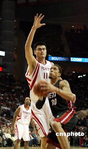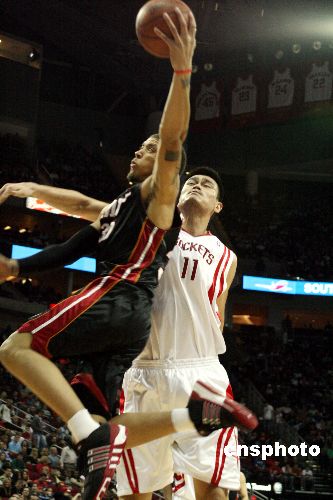 當(dāng)?shù)貢r(shí)間1月17日晚,主場作戰(zhàn)的火箭以93比86戰(zhàn)勝熱火,姚明全場十二投全中創(chuàng)個(gè)人進(jìn)攻記錄。中新社發(fā) 歐文 攝