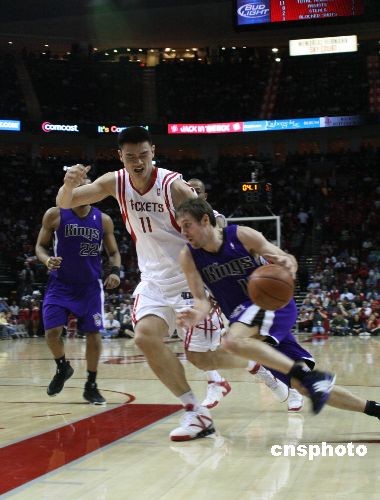 當?shù)貢r間2月11日,火箭隊在休斯頓豐田中心以94-82擊敗阿帥舊部——聯(lián)盟倒數(shù)第一的國王,贏得了全明星賽前的最后一場比賽。姚明全場貢獻了24分18個籃板,均為全場最高。中新社發(fā) 歐文 攝
