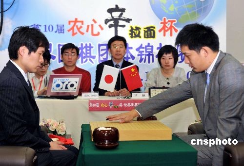 二月十七日,第十屆“農(nóng)心杯”世界圍棋團(tuán)體錦標(biāo)賽第三階段比賽在上海舉行,首戰(zhàn)由中國棋手常昊九段(右)挑戰(zhàn)日本擂主高尾紳路九段(左),本階段比賽將決出最后冠軍和2億韓元冠軍獎(jiǎng)金的歸屬。中新社發(fā) 湯彥俊 攝