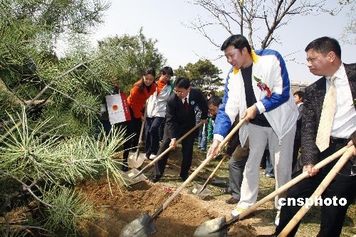 4月4日,首都第25個(gè)義務(wù)植樹日,北京林業(yè)大學(xué)以“建國60周年”和“五四”運(yùn)動(dòng)90周年為契機(jī)開展“為華夏播綠,向祖國獻(xiàn)禮”首都大學(xué)生第十三屆“綠橋”活動(dòng)暨第三屆全國青少年綠色長征接力活動(dòng)。開幕儀式上首都大學(xué)生聘請(qǐng)王治郅、林依倫、阿寶、張湘祥等文藝、體育明星擔(dān)任第八屆首都大學(xué)生“綠色志愿大使”暨“綠色長征形象大使”。圖為王治郅首都義務(wù)植樹日上植樹。中新社發(fā) 鄭雄增 攝