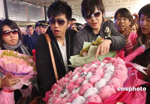 10月18日,中國內(nèi)地當紅偶像組合BOBO在北京首張EP《光榮》上市,這對2007“加油好男兒”獲獎選手付辛博和井柏然雖然剛剛踏進娛樂圈的新秀,已為華誼音樂和眾多歌迷所接受,目前兩人正在參與周迅主演的《李米的遭遇》的拍攝,對于能夠加盟這樣高起點影片的拍攝,兩個男生深深的感謝、感恩著那些讓他們從普通少年到當紅偶像的粉絲們。圖為BOBO在北京首都機場受到眾多粉絲熱烈歡迎。中新社發(fā) 錢興強 攝