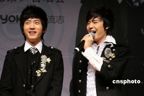 2007年10月22日,由“加油好男兒”的井柏然和付辛博組成的偶像團體BOBO組合在北京舉辦了他們的首唱會。會上他們不僅載歌載舞與歌迷互動,還收到了大師兄羽泉組合送來的禮物。中新社發(fā) 一可 攝
