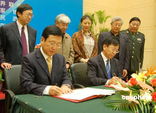 10月27日,由大連市人民政府申辦,經中國文聯(lián)、中國電影家協(xié)會考察決定,第17屆中國金雞百花電影節(jié)將于2008年9月在大連市舉行。圖為大連市代表和中國電影家協(xié)會代表簽約。中新社發(fā) 邱勇 攝