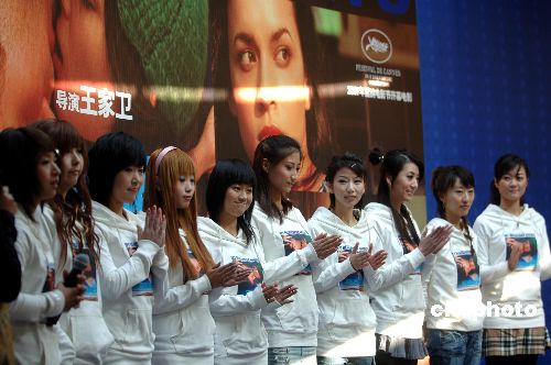 十一月二十一日,王家衛(wèi)聯(lián)合女性交友網(wǎng)站愛情公寓在北京長城腳下公社舉辦新聞發(fā)布會,通過愛情公寓征選的十位藍(lán)莓女孩集體亮相,他們還將搭乘藍(lán)莓巴士進(jìn)行為期一個月,走遍全國十個城市的旅程,女孩將會在愛情公寓網(wǎng)站中上傳每日旅行日記照片,最終由網(wǎng)友票選一位最具有藍(lán)莓精神的藍(lán)莓天使。片方希望通過這種形式宣傳,讓電影里的情節(jié)在生活中同樣可以實現(xiàn),并讓這十位藍(lán)莓女孩也有機會體會諾拉瓊斯在電影里的感情旅程。中新社發(fā) 廖攀 攝