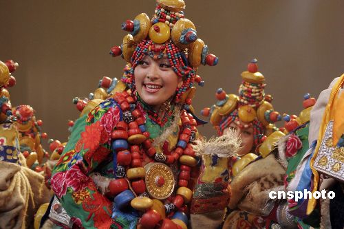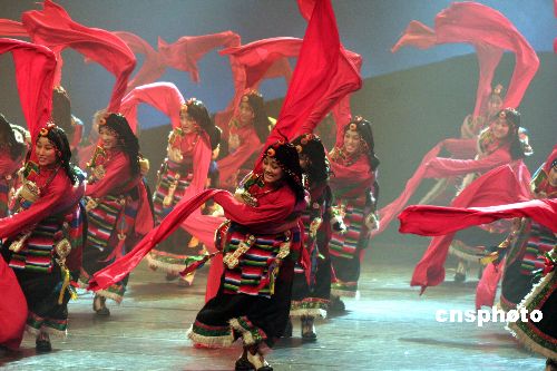 2008年1月21日,著名舞蹈家楊麗萍攜《藏謎》在?谌嗣翊髸(huì)堂上演。《藏謎》以藏族老阿媽虔誠(chéng)的朝拜路途中所見(jiàn)為主線,表現(xiàn)了藏區(qū)牧民生活、民間習(xí)俗、宗教儀式場(chǎng)景。主創(chuàng)人員用了1年多的時(shí)間,行走在藏、青、川、云等各省區(qū)的20多個(gè)藏區(qū),大量收集了音樂(lè)、舞蹈、器樂(lè)、服裝等作為原始創(chuàng)作素材。劇中8成以上的演員都是藏區(qū)的牧民,完全是原生態(tài)的演出。中新社發(fā) 尹恩彪 攝