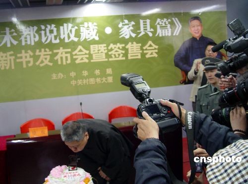 三月二十二日,著名收藏家、鑒定家馬未都在北京簽售其新書《馬未都說收藏·家具篇》。他在中央電視臺“百家講壇”對收藏文化的另類解讀,在短時間內(nèi)積聚了很高的人氣,成為繼易中天、于丹之后的又一位大眾文化偶像。當(dāng)天是馬未都53歲的生日,他在簽售現(xiàn)場吹滅生日蛋糕上的蠟燭,有趣的是在蛋糕上佇立著一個巧克力做的古色古香的老式座椅。中新社發(fā) 應(yīng)妮 攝