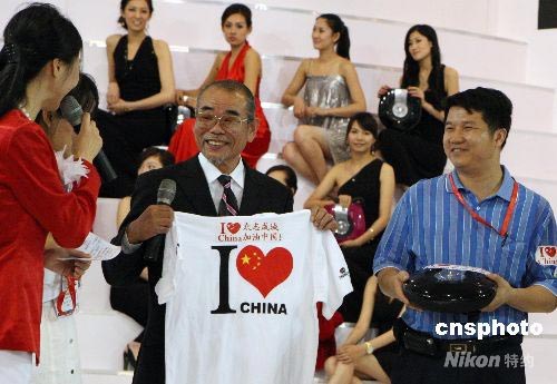 5月30日,在北京舉行的第17屆中國國際專業(yè)音響燈光樂器及技術(shù)展覽會(huì)上,卡拉OK之父井上大佑亮相雷石演出設(shè)備盛會(huì)現(xiàn)場,圖為在活動(dòng)上井上大佑參加向中國四川地震災(zāi)區(qū)賑災(zāi)拍賣活動(dòng)。中新社發(fā) 錢興強(qiáng) 攝