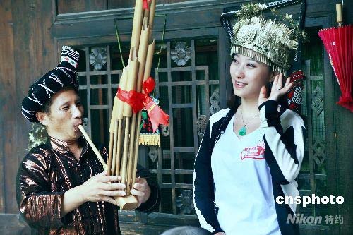 瑤族美女歌手米亮從奧運(yùn)圣火回到祖國的那一刻起,就一路追隨著圣火的腳步,帶著未完成的作品《小夢想》,沿著圣火傳遞的路徑收集聲音和簽名,希望用一首萬人合唱的原創(chuàng)歌曲作為奧運(yùn)獻(xiàn)禮。在到達(dá)江西老區(qū)境內(nèi)時,正遇四川汶川縣發(fā)生強(qiáng)烈地震。于是,她毫無猶豫的加入到捐款的隊伍,并沿途收集了近千名兒童為災(zāi)區(qū)小朋友親手制作的祝?,然后又沿途轉(zhuǎn)送給在各地治療的災(zāi)區(qū)兒童。被稱為圣火傳遞中救災(zāi)捐款的最美女孩。 2008年6月8日,米亮追逐圣火到達(dá)南寧,她首先做的一件事,就是到廣西區(qū)人民醫(yī)院看望災(zāi)區(qū)受傷的兒童,并送上祝?。美女米亮,為南寧的景色所傾倒,禁不住換上民族服裝,在南寧留下美好印記。中新社發(fā) 駱文剛 攝