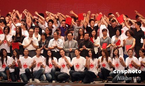 6月19日晚,由中國服裝設(shè)計師協(xié)會在北京舉辦的“人文奧運”時尚成衣發(fā)布會暨“愛心·時尚”賑災(zāi)捐贈會上,“中國模特愛心行動”再掀一個高潮,中國內(nèi)地名模代表們通過現(xiàn)場宣誓,吹響“中國模特愛心行動”全面啟動的號角,“中國模特愛心行動”將在今后定期或不定期的舉辦各種形式的宣傳活動籌集善款,并全部用于資助災(zāi)區(qū)及其它貧困地區(qū)的兒童教育事業(yè)。中國扶貧基金會收到全額款項后,將根據(jù)中國服裝設(shè)計師協(xié)會職業(yè)時裝模特委員會的意愿,點對點落實為災(zāi)區(qū)小學建立圖書室、電腦房等。圖為中國時裝設(shè)計師、模特以及中國服裝業(yè)內(nèi)人士一起參加愛心行動啟動。中新社發(fā) 錢興強 攝