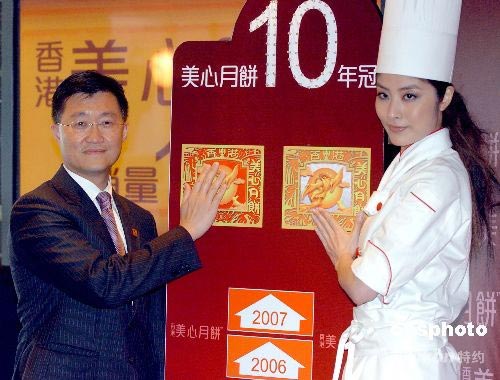 六月二十六日,香港美心飲食集團(tuán)舉行“美心月餅”新聞發(fā)布會(huì),集團(tuán)總經(jīng)理李文賢(左)與“美心月餅”代言人陳慧琳共同主持本年度新一輯相關(guān)食品的電視廣告首映禮。中新社發(fā) 鄧慶樂 攝