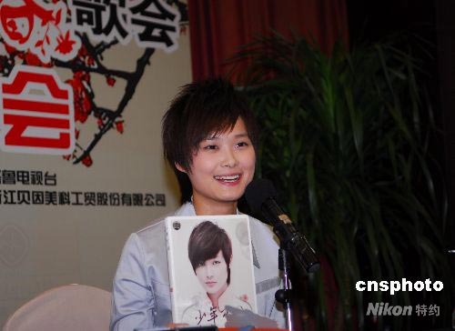 2008年7月13日,歌手李宇春做客山東,參加齊魯電視臺(tái)《粉絲大派送》,會(huì)見(jiàn)龐大的“玉米”歌迷,并為她的迷你新專(zhuān)輯《少年中國(guó)》做宣傳。中新社發(fā) 崔鵬森 攝