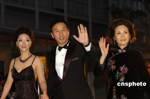 10月18日傍晚,第21屆東京國際電影節(jié)開幕。以“環(huán)保”為主題的本屆電影節(jié)別出心裁地將星光大道的地毯由紅色改為綠色。上個(gè)月剛剛當(dāng)選日本首相的麻生太郎與開幕影片《赤壁》劇組成員同走綠地毯,成為第一個(gè)光臨東京國際電影節(jié)現(xiàn)場的日本總理大臣。圖為參加本屆電影節(jié)競賽單元角逐的中國著名導(dǎo)演馮小寧及電影《超強(qiáng)臺(tái)風(fēng)》主要演員。中新社發(fā) 朱沿華 攝