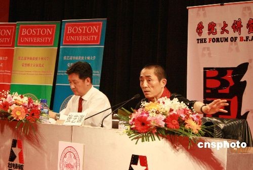 11月7日下午2點(diǎn),北京電影學(xué)院82屆畢業(yè)生、國際著名導(dǎo)演張藝謀回到母校北影學(xué)院,首度在奧運(yùn)之后公開談?wù)撚勺约簩?dǎo)演的奧運(yùn)開幕式的創(chuàng)作感想。在與眾多北影學(xué)生交流之前,張藝謀被授予了美國波士頓大學(xué)榮譽(yù)博士稱號,并在電影學(xué)院標(biāo)放廳進(jìn)行了簡短的宣布儀式。中新社發(fā) 墮天 攝