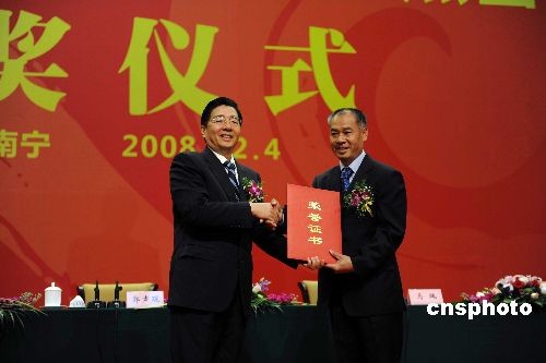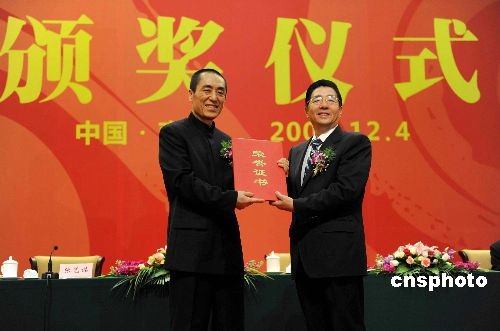十二月四日,中共廣西壯族自治區(qū)委員會(huì)、廣西壯族自治區(qū)人民政府授予著名導(dǎo)演張藝謀“廣西杰出貢獻(xiàn)獎(jiǎng)”,獎(jiǎng)勵(lì)一百萬(wàn)元人民幣。中新社發(fā) 蔣雪林 攝