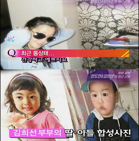 預(yù)產(chǎn)期在09年1月的金喜善近期被頻頻曝光,不光有好友在博客里面公開了她的最新照片,婆婆更對(duì)媒體表示將有個(gè)小孫女。日前,韓國(guó)網(wǎng)絡(luò)上還出現(xiàn)了號(hào)稱“金喜善未來(lái)寶寶模樣”的相關(guān)合成照。