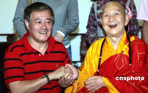 在海南三亞度假的中國著名喜劇小品笑星趙本山,二月四日攜妻兒專程到南山景區(qū)參觀游覽。圖為他與南山寺方丈新成大和尚在一起喝茶暢談。中新社發(fā) 陳文武 攝