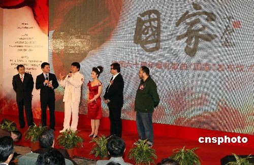 2月28日,國慶60周年獻(xiàn)禮歌曲《國家》在北京人民大會(huì)堂舉行發(fā)布儀式。海內(nèi)外華人音樂者全情投入,協(xié)力打造成為這首主旋律歌曲的一大亮點(diǎn)。中國移動(dòng)將利用無線音樂平臺(tái)對(duì)其進(jìn)行全程推廣,使這首歌跨越空間的阻隔,向全球華人傳遞信心與力量。國際巨星成龍專程從云南拍片現(xiàn)場趕來參加歌曲發(fā)布儀式。現(xiàn)場通過視頻播放鋼琴巨星郎朗從紐約錄制傳來的創(chuàng)作感言。作曲家金培達(dá)、音樂制作人余秉翰來自香港。參加發(fā)布儀式的還有來自北京的總策劃之一、詞作者王平久和演唱者劉媛媛。中新社發(fā) 杜洋 攝