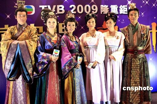 三月二十三日,《宮心計》在香港會展中心舉行開幕儀式。圖為演員佘詩曼、米雪、關菊英等在儀式上合影。中新社發(fā) 張勤 攝