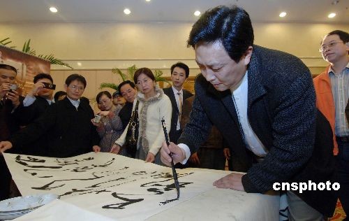 三月二十四日,在電視連續(xù)劇《鄭和下西洋》中飾演明成祖朱棣的著名演員唐國(guó)強(qiáng)在福州舉行的該劇開播儀式上現(xiàn)場(chǎng)揮毫題字。該劇是為紀(jì)念鄭和下西洋600周年特別拍攝的,由福建省委宣傳部、中央電視臺(tái)文藝中心影視部及長(zhǎng)樂市委、市政府等單位聯(lián)合出品!多嵑拖挛餮蟆肥吩(shī)般地描述了鄭和率領(lǐng)船隊(duì)七下西洋,歷時(shí)二十九年,成功開辟海上絲綢之路的壯舉,展現(xiàn)了鄭和七次下西洋在政治、經(jīng)濟(jì)、文化、外交、科技等領(lǐng)域取得的輝煌成就。中新社發(fā) 劉可耕 攝