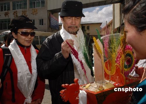 3月24日,孫海英、呂麗萍夫婦受邀參加“5.12中國(guó)愛——中國(guó)嬌子愛心行動(dòng)”,在西藏進(jìn)行一系列愛心公益活動(dòng)。抵達(dá)西藏,孫海英、呂麗萍夫婦受到當(dāng)?shù)孛癖姷臍g迎,藏族美女給孫海英敬上了大碗青稞酒。中新社發(fā) 龍昊 攝