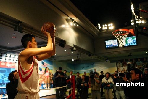 NBA中國球員姚明的蠟像18日首次在紐約杜莎夫人蠟像館與公眾見面,引來眾多媒體關(guān)注。 中新社發(fā) 李靜 攝