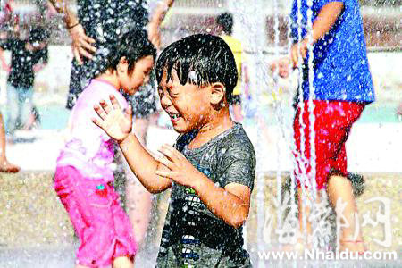 。天氣太熱,很多人選擇到溪河里泡水解暑,有的到大百貨商店吹冷氣,孩子們則選擇了到廣場的噴水池嬉水。動物們也熱得受不了,動物園給猴子們準備了冰塊降溫,外出的狗狗們則被戴上了太陽鏡,遮擋熾熱的陽光。