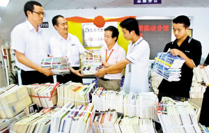 昨日上午,(深圳)寶安區(qū)圖書館富士康流動分館揭牌儀式在寶安區(qū)圖書館大堂內(nèi)舉行,揭牌儀式現(xiàn)場堆放著1萬冊圖書,這些圖書都是準(zhǔn)備送往富士康流動分館的觀瀾廠區(qū)。
