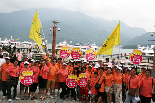 在日月潭游艇停泊的入門廣場,幾十名來自廣州“廣之旅”的游客興高采烈地?cái)[出姿勢拍照。其中一位女游客說,幾天的臺(tái)灣游花費(fèi)了逾8000元人民幣,包括1000多元的手信。