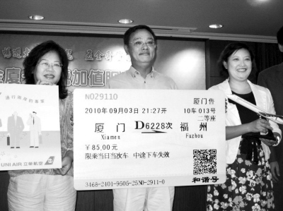 “11年前我就是搭第一班‘小三通’輪船去福州,今天(9月3日)又在臺(tái)灣買到了第一張動(dòng)車火車票,真是感慨萬(wàn)分。我上次回福州還要自己在廈門排隊(duì)買車票,這次就不用了,真是太方便啦!3日上午,福州臺(tái)商張鳴齡先生興奮地從臺(tái)灣三菱旅行社總經(jīng)理周惠全手里接過車票模型,宣告大陸動(dòng)車車票在臺(tái)灣正式開賣。