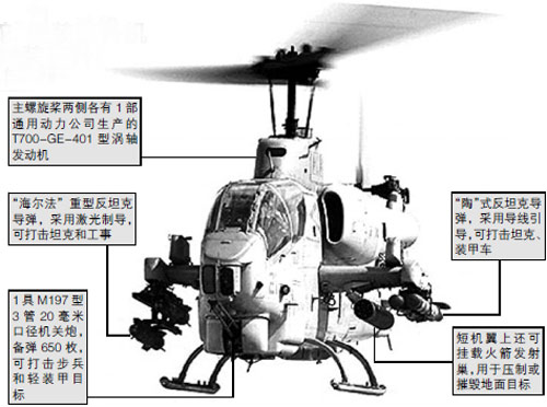 AH-1W武裝直升機(jī)機(jī)長約18米,高4米,最大起飛重量近6700公斤,采用串列座艙設(shè)計(jì),由2名機(jī)組成員操控,裝備有機(jī)關(guān)炮、火箭彈、空空導(dǎo)彈和反坦克導(dǎo)彈,是目前臺軍直升機(jī)部隊(duì)中攻擊力最強(qiáng)的機(jī)型。(何西)