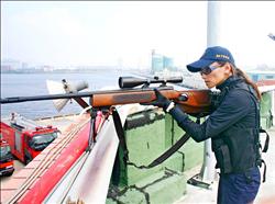 臺南市警察局相關單位昨在安平港演練船只遭外籍歹徒劫持勒索,從陸海空全面包抄合作救人,過程逼真。鄭蓮玉經特殊任務警力訓練合格,在反劫船任務演練中擔任狙擊手,持狙擊槍在頂樓瞄準歹徒,準備隨時配合行動射擊,架式十足。