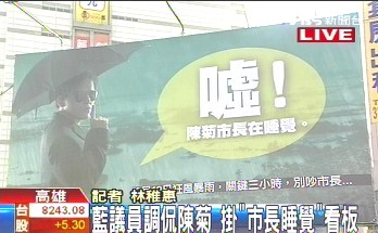 中新網(wǎng)10月1日電 據(jù)臺灣TVBS報道,高雄市長陳菊坦承在919風災(zāi)當天下午,人在官邸休息,風波持續(xù)延燒,藍營議員昨天(9月30日)下午在高雄市中心,掛上調(diào)侃陳菊市長的廣告牌,內(nèi)容是一名黑衣人回頭比“噓,市長在睡覺”,極盡調(diào)侃之能事。