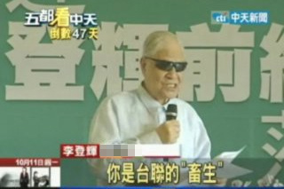 中新網(wǎng)10月12日電 據(jù)臺(tái)灣“今日新聞網(wǎng)”報(bào)道,“你是臺(tái)聯(lián)(‘臺(tái)聯(lián)黨’)的‘畜生’!”李登輝11日在替民進(jìn)黨新北市長(zhǎng)參選人蔡英文站臺(tái)時(shí)出現(xiàn)口誤;蛟S是真的年紀(jì)大了,李登輝這次替蔡英文助陣,不但講到激動(dòng)處時(shí),手抖個(gè)不停,還口誤連連,讓坐在一旁的蔡英文只能尷尬地笑。