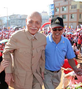 酷似蔣介石的李登科,成為臺灣吸引大陸觀光客的新武器。圖為李登科(中)2009年在金門為縣長參選人李沃士輔選時,民眾爭相目睹他風(fēng)采的情形。圖片來源:“中央社”