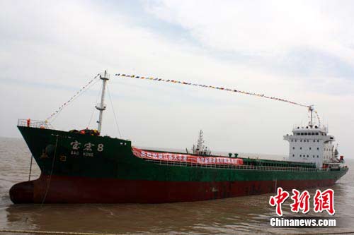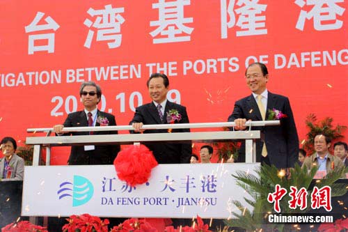 中新網鹽城10月19日電 (記者 于從文)19日上午11時18分,隨著中共鹽城市委書記趙鵬一聲宣布,鹽城地方政府官員與臺灣基隆港物流協會會長共同啟動拉桿,一艘“寶宏8號”貨輪緩緩離岸駛向臺灣基隆港,江蘇大豐港與臺灣基隆港實現首次直航。