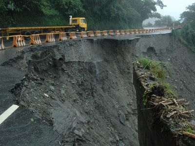遭遇豪雨的蘇花公路遇雨則坍,南方澳到東澳間多處坍方。臺灣“災(zāi)害應(yīng)變中心”表示,一輛弘泰旅游公司載運大陸觀光客的游覽車在東澳受困,疑被落石擊中,大陸導(dǎo)游及司機困在變形車體內(nèi),深夜確定2人死亡,其他旅客無恙;另傳有一輛創(chuàng)意旅游公司的游覽車,搭載廣東團共19人失聯(lián)。
