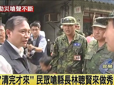 昨天天氣短暫放晴,宜蘭縣長林聰賢巡視淹水災區(qū),卻出現(xiàn)不尋常的現(xiàn)象,幾乎走到哪就被罵到哪,一名民眾說,都淹了好幾天了,還是靠著臺北的女兒上網(wǎng)把淹水的情況公布給大家知道,縣長這個時候才到。也有老婦人說,淹水的時候看不到縣政府的人員前來,還不是靠著自己的力量清理家園,都快清得差不多了,縣長才出現(xiàn)。