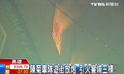 據(jù)報(bào)道,陳菊23日到高雄縣的永安、彌陀和梓官等鄉(xiāng)鎮(zhèn)車(chē)隊(duì)掃街拜票,傍晚17點(diǎn)多行經(jīng)梓官鄉(xiāng)光明路時(shí),支持者和車(chē)隊(duì)沿途放沖天炮,突然有民眾目擊,沖天炮飛竄到一家電子專賣(mài)店三樓的鐵皮屋,火勢(shì)并且迅速延燒到左右兩邊的民宅三樓,消防局17點(diǎn)20分接獲報(bào)案后,出動(dòng)7輛消防車(chē)前往搶救,17點(diǎn)58分控制火勢(shì),18點(diǎn)15分將火勢(shì)完全撲滅,幸好沒(méi)有民眾受傷,不過(guò),三間民宅的三樓頂都已經(jīng)被燒毀,陳菊競(jìng)選總部事后表示,會(huì)協(xié)助修復(fù)。