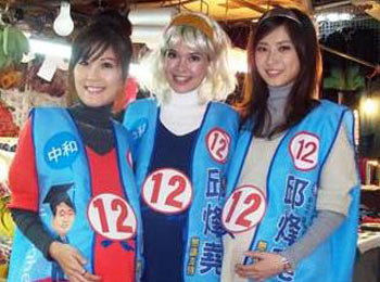 “政大4姬”中的柯念萱、高玉穎、沈易儒扮孕婦,以“大腹力挺”的人體廣告,進(jìn)入熱鬧的菜市場(chǎng)拜票,其中,混血兒柯念萱更是以金發(fā)造型,高喊“凍蒜(當(dāng)選)”,吸引爆滿民眾圍觀。