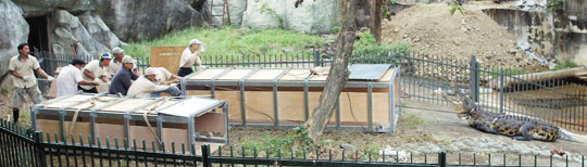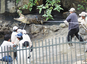 由于無(wú)人敢接近河口鱷,保育員采繩索硬拖拉法,八名保育大漢像拔河一般,將河口鱷硬拉進(jìn)長(zhǎng)鐵籠內(nèi)。隨后又以同樣模式,再硬拖重約一百三十公斤母鱷進(jìn)入另一鐵籠,以吊車(chē)先后安移入新居,與凱門(mén)鱷隔欄而居。