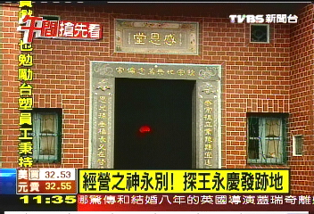 中新網(wǎng)10月16日電 臺(tái)灣“經(jīng)營(yíng)之神”王永慶今天去世。臺(tái)灣TVBS報(bào)道說(shuō),白手起家的他,當(dāng)年就是從新店直潭發(fā)跡,祖厝“感恩堂”還保留著當(dāng)年三合院的格局,盡管不是出身大戶人家,不過(guò)外頭有一道龍形圍墻,王永慶日后確實(shí)也像這龍一樣事業(yè)飛黃騰達(dá)。