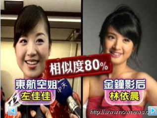 身穿紅藍(lán)色旗袍,空姐們一字排開(kāi),她們都是參與直航包機(jī)、由航空公司精挑細(xì)選出的美麗代表,仔細(xì)看,一位笑容甜美的空姐是不是很像誰(shuí)呢?東航空姐左佳佳說(shuō),乘客說(shuō)她長(zhǎng)得像林依晨,她也覺(jué)得自己笑起來(lái)的樣子挺像的。其實(shí)左佳佳不只是笑容,她彎彎的眼睛,還有圓潤(rùn)的臉型,跟林依晨至少有80%相似程度。
